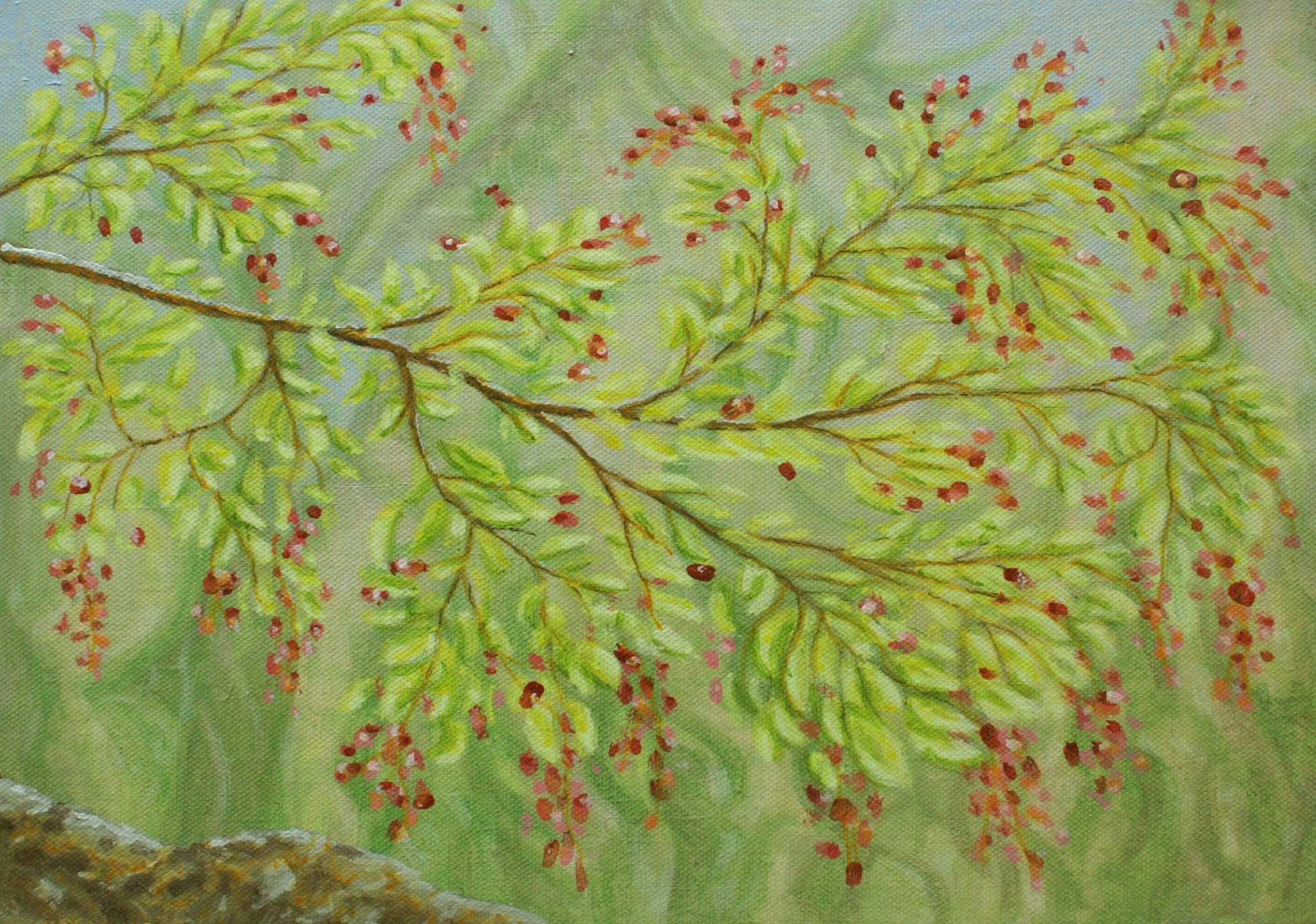 An impression of a branch of a decorative cherry tree in flower in our local park. It stands on the bank of the lake and is a beautiful sight each spring when the sun catches the pink against he many shades of green, both in this tree and in the weeping willows behind it. The reflections beneath are of the willow too.