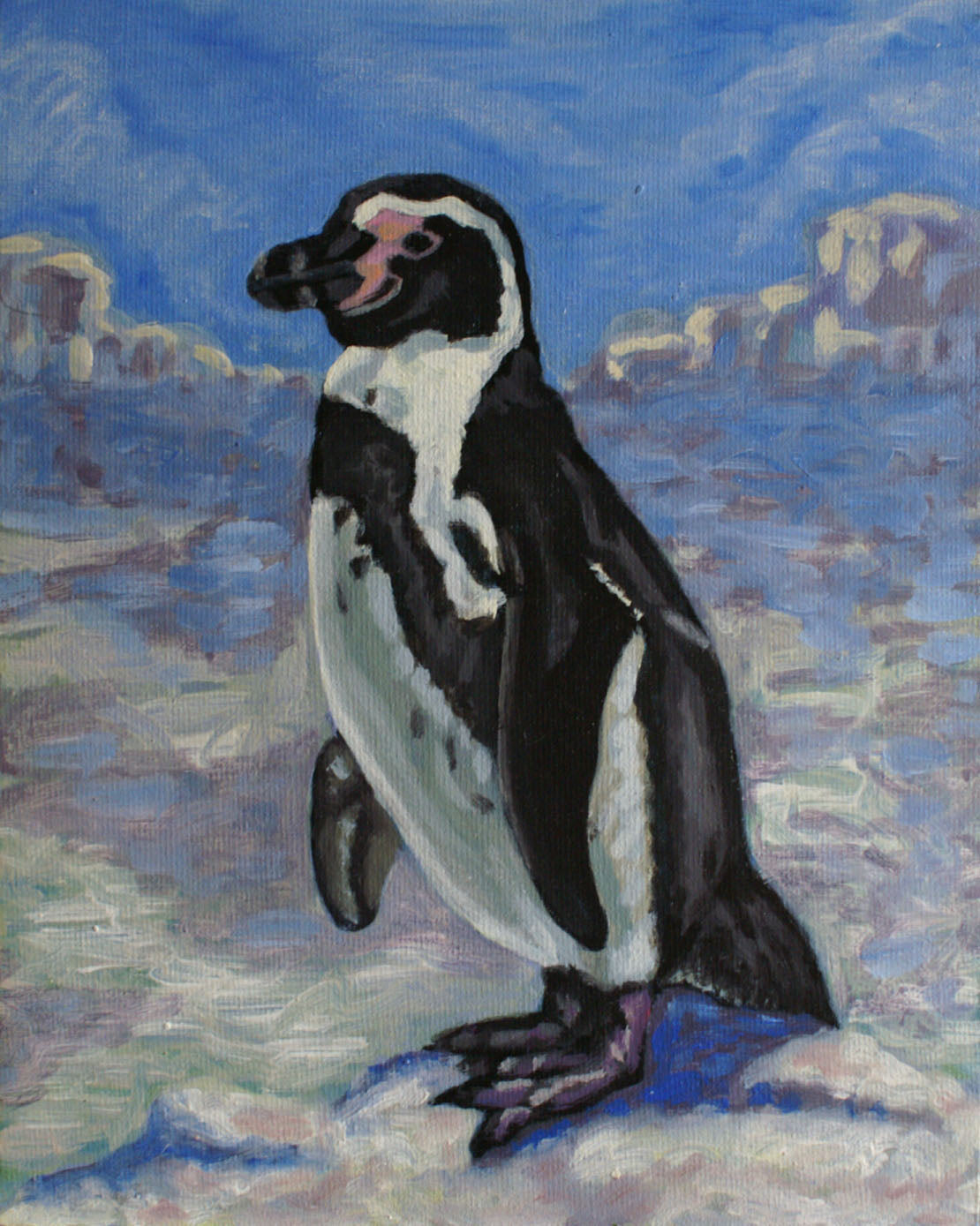 An acrylic portrait of a Magellanic penguin, painted by myself in 1996, part of a series of penguin paintings that I have made over the years. I love penguins, they have great characters and pose so well. We have seen several different types of them in captivity in zoos over the years and always take a great many reference shots. These penguins, like the Humboldt, are native to the coastal areas of southern South America. The title refers to the Biblical creation story, to the day when the sea creatures and the birds were created. Penguins span both categories! I've placed it in a more wintery setting, as it was originally designed for possible use as a Christmas card by the Mouth and Foot Painting Artists.