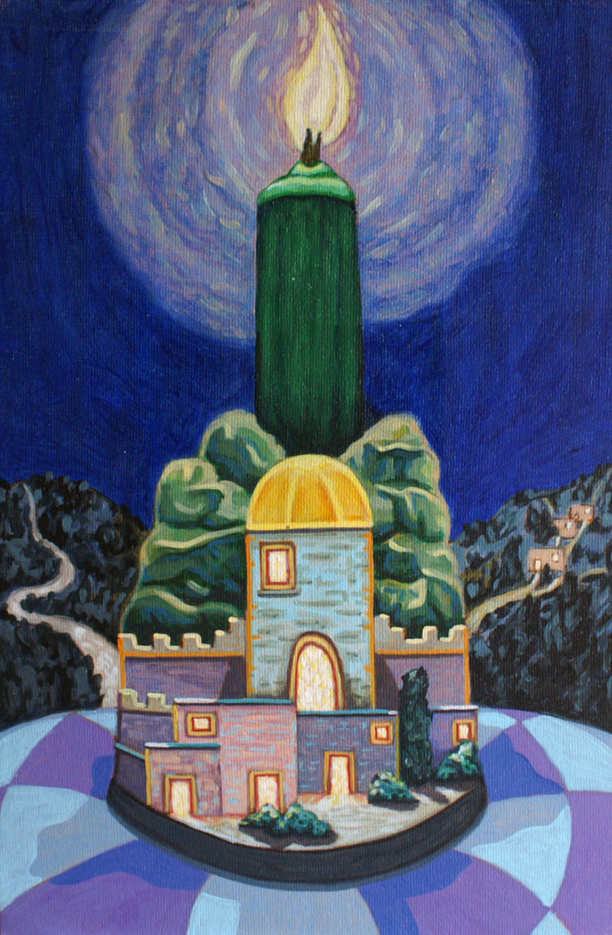 One of a series of conceptual paintings around the theme of light at Christmas, this is painted in acrylic on a canvas panel which is 14" x 9.75" (356mm x 236mm). It is unframed.