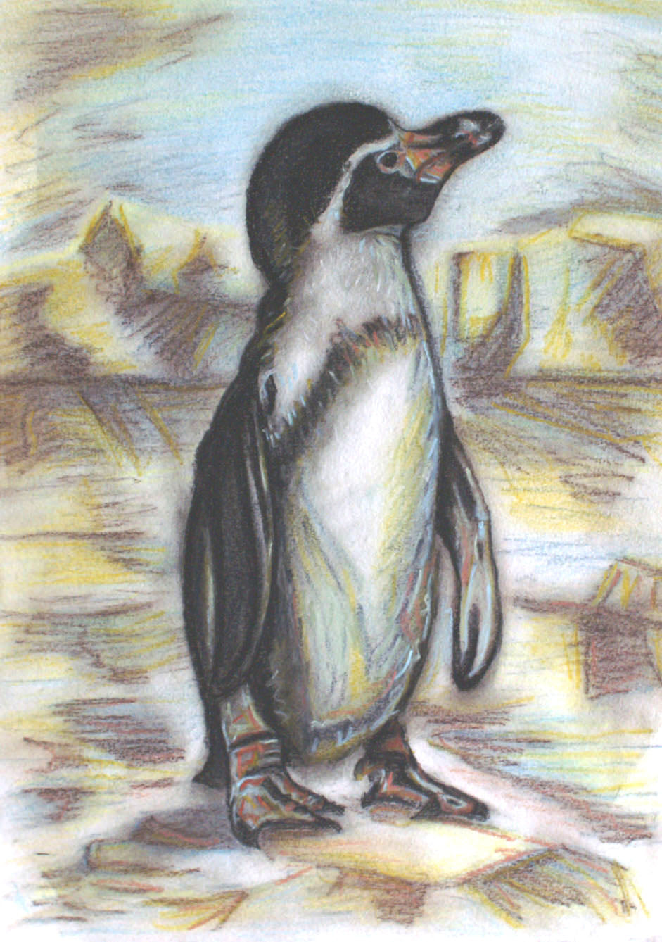 This little chap is drawn with pastel pencils - holding ordinary pastels in my mouth to draw with is not an option! I decided to make the background more angular to contrast with the penguin's gentle curves.