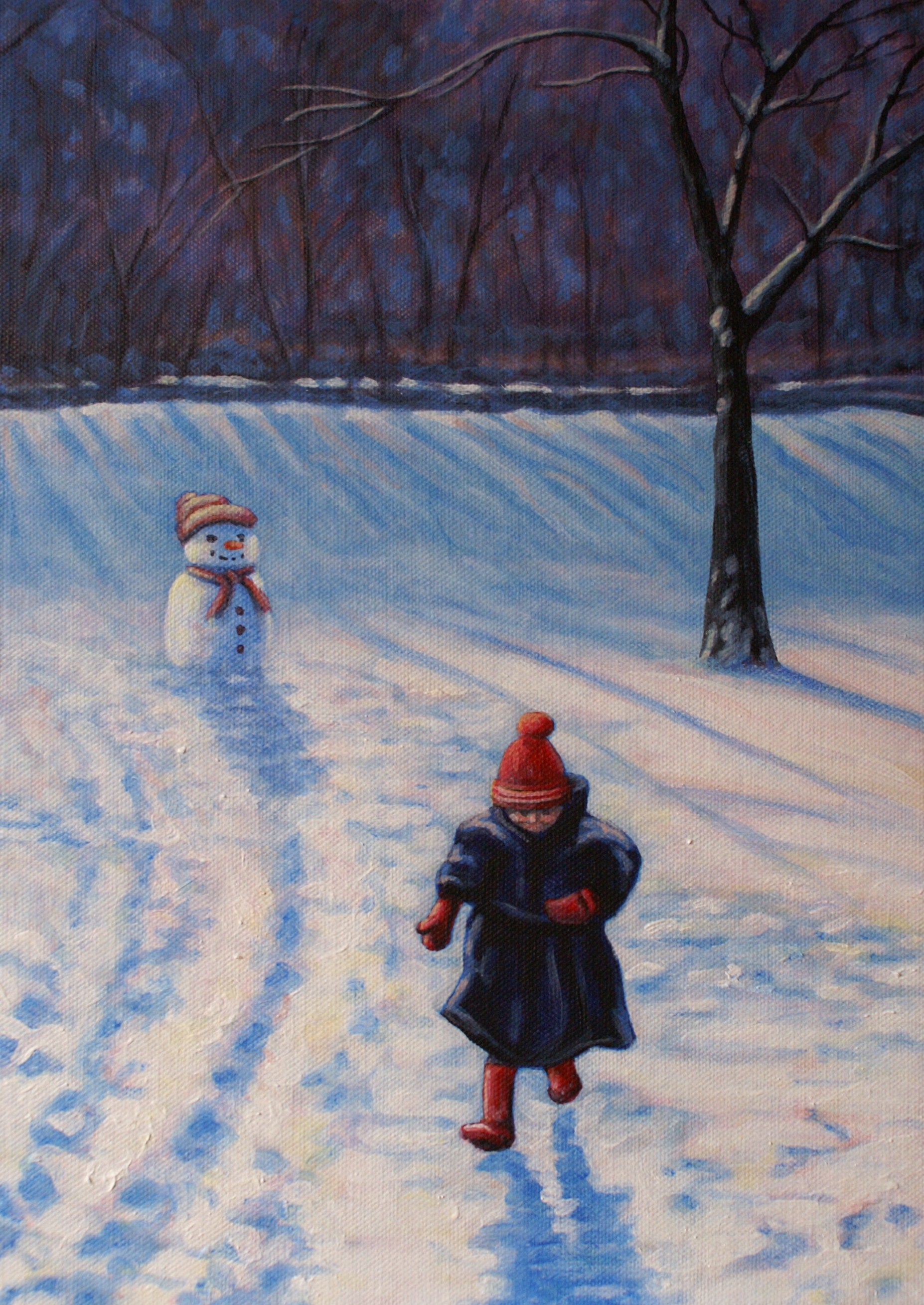 This painting is based in our local park when we had a fall of deep snow. We took a lot of photos when our children were little of course, and some have been used as sources for compositions over the years, often taking elements from several to make a complete painting. This is the case here, with the park as a base, the snowman from our garden, and our daughter running along the pavement captured with both feet off the ground!